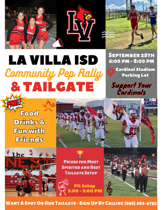 Come and join us at our Community Pep-Rally and Tailgate on Wednesday, September 28th, from 6:00 - 8:00 pm. If you want to reserve a spot call (956)262-4755. See you there!