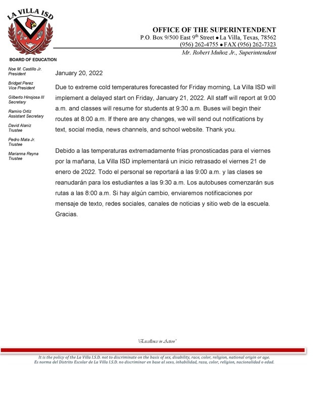 Delayed start of school for tomorrow - Fri. (1/20)