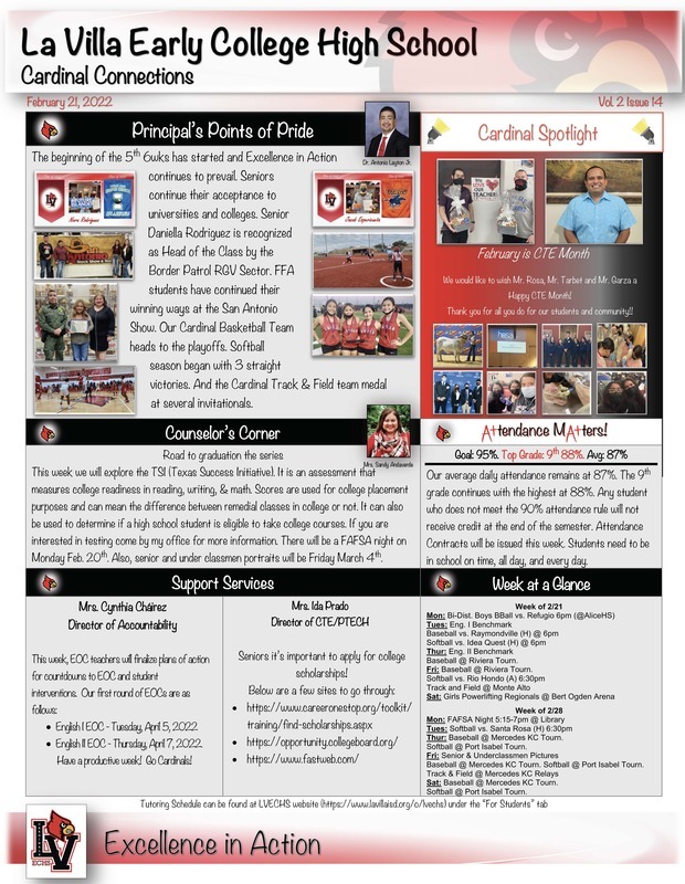 The beginning of the 5th 6wks has started and Excellence in Action continues to prevail. Here is Cardinal Connections Volume 2 Issue 14 which is also available on our website under the "News" tab. You can also use the link below.
