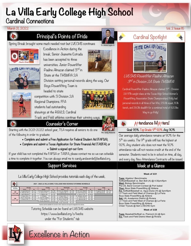 Spring Break brought some much needed rest but LVECHS continues Excellence in Action during the break. Here is Cardinal Connections Volume 2 Issue 16 which is also available on our website under the "News" tab. You can also find the newsletter by using the link below.