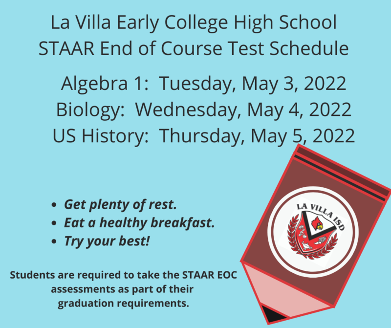 Next week, our LVECHS students will be taking the Algebra I, Biology, and US History STAAR EOC exams. We encourage our students to get plenty of rest the night before and do their best! Good Luck!