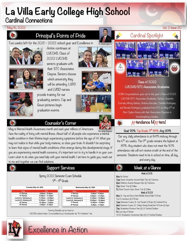 Two weeks left for the 2021 – 2022 school year and Excellence in Action continues at LVECHS. Here is Cardinal Connections Volume 2 Issue 20 which is also available on our website under the "News" tab. You can also find the newsletter by using the link below.