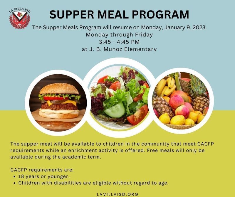 The Supper Meal Program will resume Monday, January 9, 2023. All children from the community 18 years of age and younger qualify.