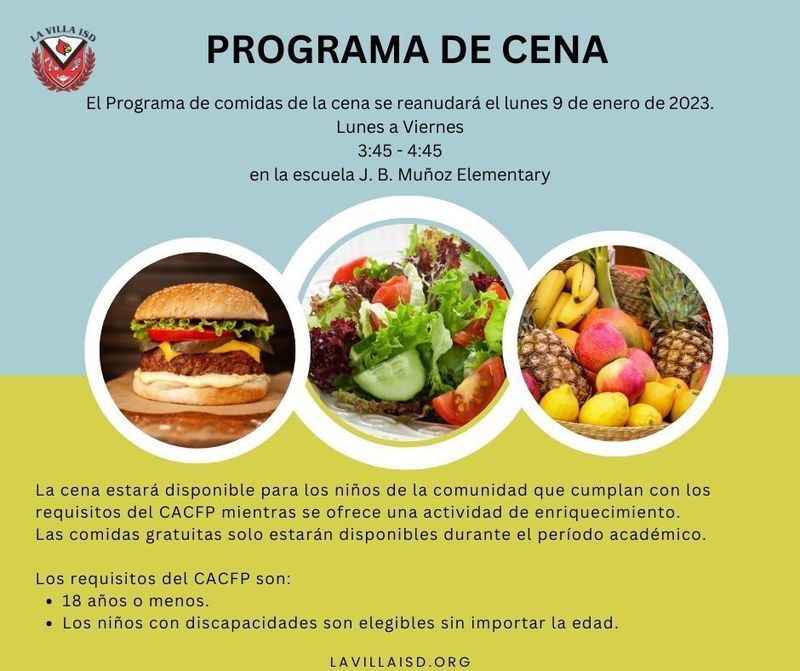 El programa de cena se reanudará el lunes 9 de enero del 2023. Todos los niños de la comunidad de 18 años o menos califican.